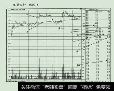 图2一2中,1是最新价移动线。2是平均价移动线。3是买人价和卖价。4为量比:每分钟的平均成交量与过去5个交易日每分钟平均成交量之比。5是外盘内盘:外盘又称主动性买盘,内盘为主动性卖盘。6为换手率:在市场中股票转手买卖的频率。7为总股本和流通盘:华夏银行总股本49.9亿,现实际流通37.8亿。8为每股收益:指当期净利润除以当期净资产,普通股所获得的净利润。9为动态市盈率:以静态市盈率为基数,乘以动态系数。10表示:S是卖出成交,B是买人成交,500手以上用紫色显示。