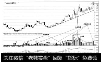需要说明的是.在G处出现了V形量(凹洞量)。此时量增价升量减价跌。量价关系配合良好:而且股价在急剧缩量回调的低点获得上升通道下轨的支撑.所以这是一个极佳的买入时机。
