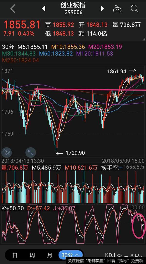 上图是创业板30分钟分时图,从成交量和KDJ指标看,明天短线有回调走势,可能得低点在1840点,向上可能在1880点附近。