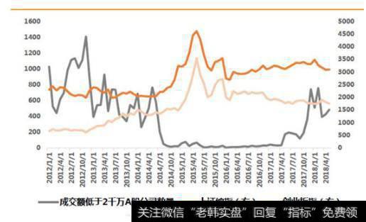 截19日收盘,当前正常交易的公司中,共619 家公司股价接近预警线,其中跌破预警线公司共564 家。股价接近平仓线的公司共425 家,其中353 家跌破平仓线。这些跌破平仓线的股票大多为中小创。而中小创的流动性越来越差,截止6月中,从成交金额的分布来看,A 股已经呈现出明显的马太效应,25%左右的龙头公司占了75%左右的交易额。如果将市值50 亿一下,日均成交额2000 万以下列为不活跃个股,我们可以看到,17年以来,不活跃个股数量正在快速增加。下图为成交额低于2000万的A股公司数量: