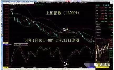 如下图中A处显示,股指以一根阳线的下影线虚破BOLL线下轨后又向上启动,同时LWR指标在70以上形成向下交叉(B处),之后股指进入中长期上涨。这表示市场调整结束,重拾升势,应重仓买入。
