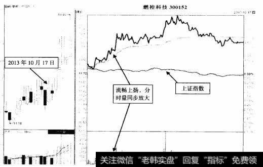 图2为燃控科技(300152)2013年10月17日分时图,如图标注所示,当日此股的分时图也是典型的强势特征。在这一分时图中同样可以看到强于大盘的运行,流畅的分时线伴以放大的量能,分时线稳健运行于均价线上方。强于大盘的分时图预示着个股短期内有上冲倾向,是短线买入信号,操作中,我们可以结合个股的盘中震荡走势,择机买入。