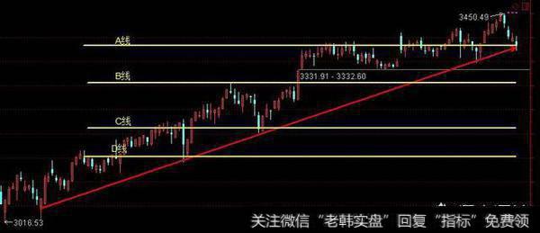 在周六周日,关于这日线图,我们画了不下100多个,这图还是比较可以指导股友们在接下来的操作,首先我们来看下,自从3000点启动到本周一的3450.49点,大盘明显的节奏就是:急跌缓涨,这是完全符合当下国家队对慢牛的要求,看上图,大盘突破D线之后,出现过一次大阴线回踩D线的过程,而回踩后的突破C线后,也出现过放量回调阴线回踩C线的行情,但是自从大盘2根大阳线突破B线后,整体指数走势有些偏快,虽然后期出现了缩量的碎步下行,但是两根阳线点燃的热情,似乎没有压下去!