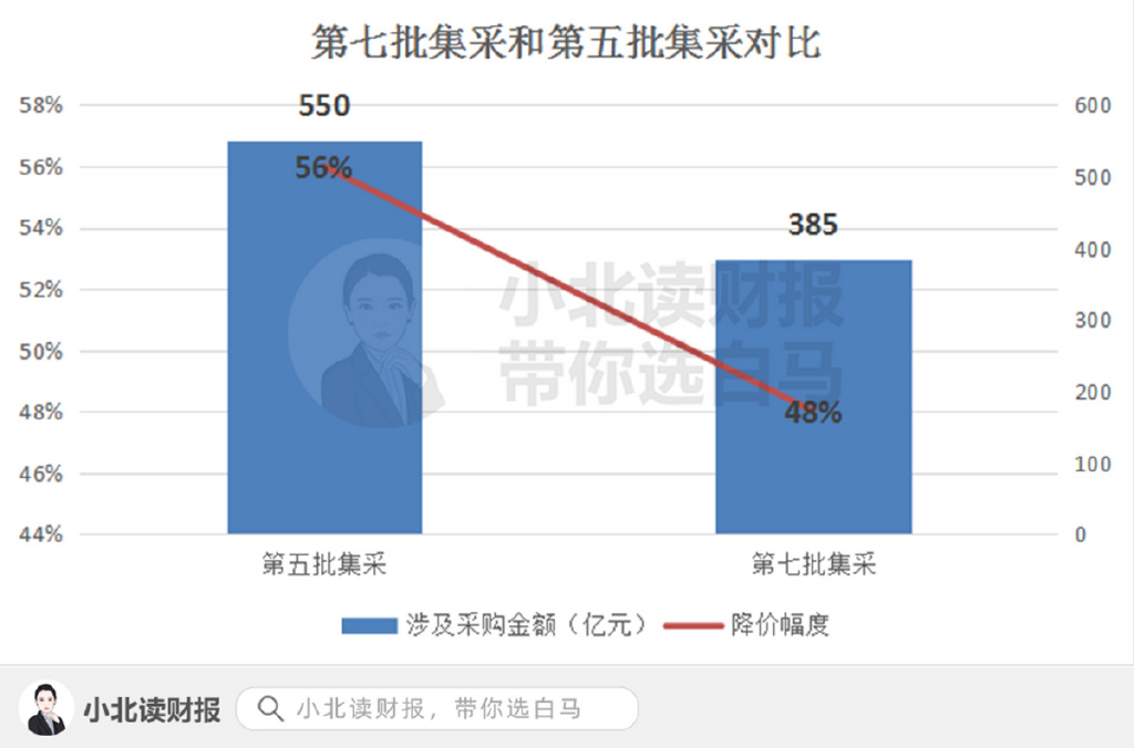 对比第五批集采,第七批集采整体降价幅度小了8%,同时产品数量虽然和第五批集采相差不多,但按集采前价格来算,采购规模也减少了约30%。