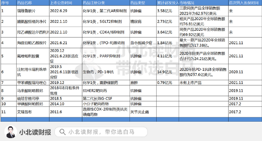 除此之外,从创新药管线来看,自去年年底到今年,还有三款药没有纳入医保,分别为脯氨酸恒格列净片、羟乙磺酸达尔西利片、瑞维鲁胺片,虽然预计今年年底这三款产品还有加入医保的可能,会有降价压力,而且面临不同的竞争环境,但三者均为首个国产原研药,预计将保留一定的利润空间,而且加入医保后还将面临较大的市场空间。