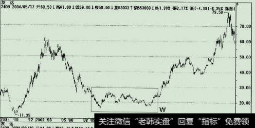 首先把标示w的方框与整体股价波动的对应关系,先做定位与了解,从图中可以很明显地分辨W是处于前波上涨之后,拉回修正相当深的低位位置,因此出现长期扩底让筹码沉淀,是必要的手段,那么投资人如何得知该股己经进入长期的扩底行情?只要从当时最低价起涨,涨幅至少超过45%以上,那么股价就有机会进入长期的扩底整理走势。