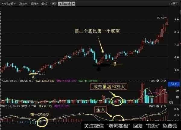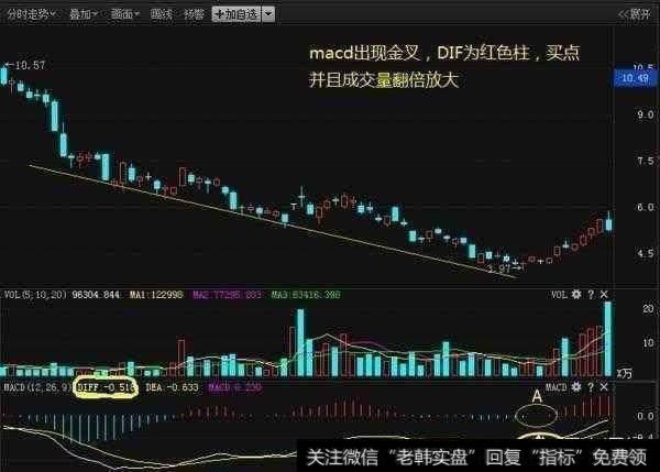 MACD指标快速线与慢速线金叉向上。MACD出现两次金叉,且两个金叉点底部抬高,买点为第二个金叉点。股价处于下降趋势,一个底比一个底低,DIF柱必须是红色才可参与。成交量出现放量。