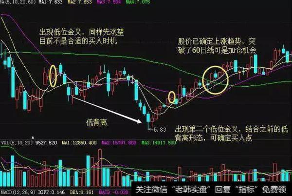 市场处于上升趋势,股价底部抬高,而MACD底部缓慢降低。第一次金叉的位置是在第二个底比第一个底低的位置,买点是第二个底MACD金叉的位置。MACD金叉时,成交量要出现温和放大。买点的空间要和前期压力位的距离在20%以上。